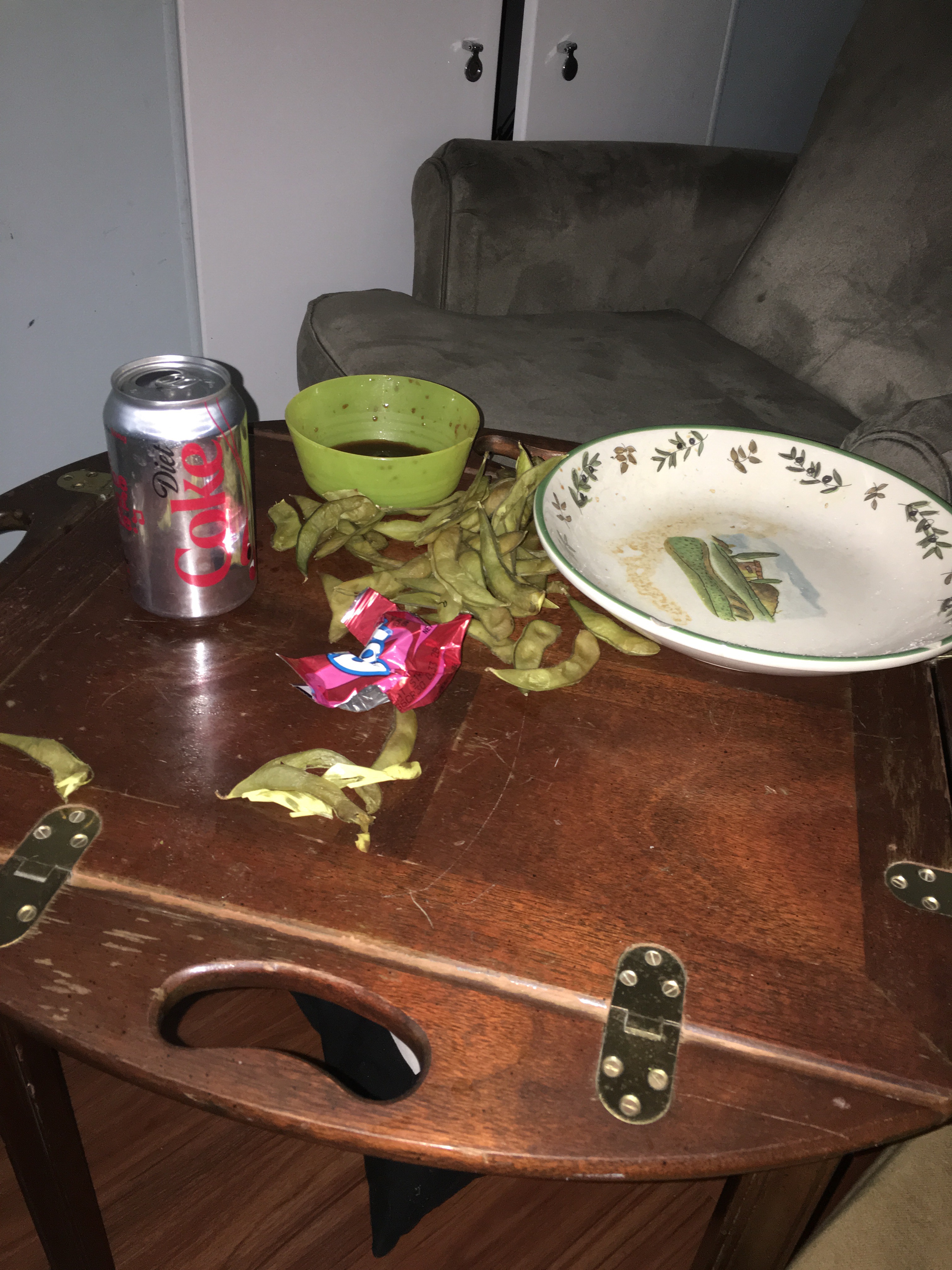 • Crime scene #2: tv room. Root beer bottles, coffee cups, Gatorades, half-full diet cokes, crusty bowls with spoons in them containing the remainder of who knows what, at least 45 feet of Froot By The Foot wrappers on the floor, more popcorn bags on the couch and the kicker… Empty edamame pods- not in a bowl- but beside a bowl on a table. What was in that bowl, you might ask? Soy sauce. So much soy sauce on every surface of the room.