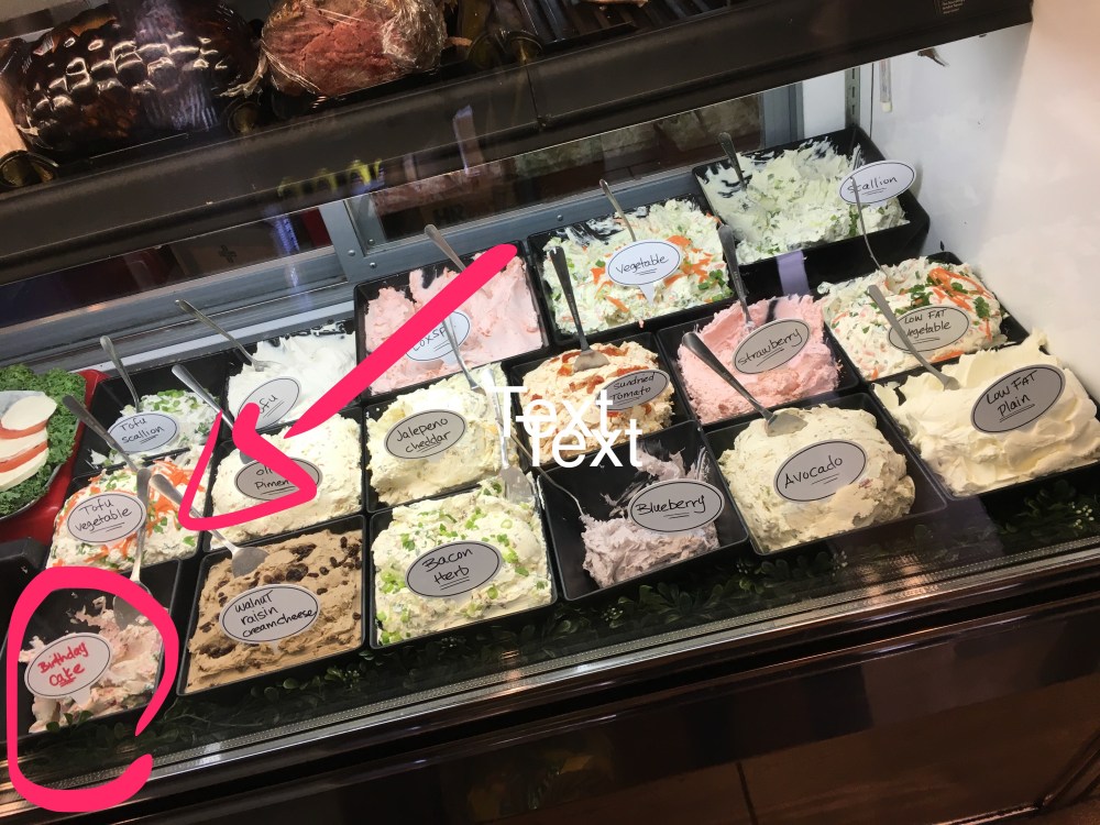 As I prepared to get in a cab for the airport, I picked up one last bagel and was drawn to the sea of cream cheese choices. Note the lower left option. BIRTHDAY CAKE CREAM CHEESE. If you think I didn’t buy some, you don’t know the Grance.