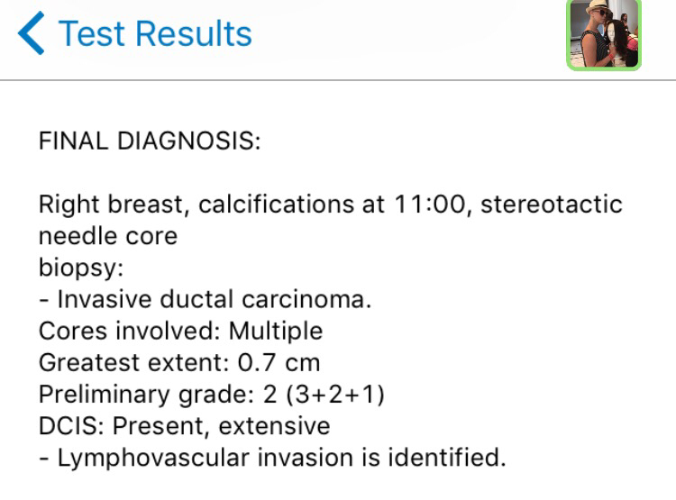 I had had a biopsy, as a mammogram had shown a tiny area of calcification that the doctors were sure was nothing. I was told I would be called with the results in 2-3 days. I was approximately 0% worried and went on with my life.