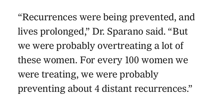 Ok. Let’s unpack this a little. “Some women 50 and younger might benefit from chemo even if the gene-test results suggested otherwise. It is not clear why.” To me, this sentence is burying a pretty significant lede. It’s basically like saying, ‘If you are younger than 50 and you get breast cancer, this study basically doesn’t matter.’ It begs the question, who was a part of this study? Was it all women over 50? This detail is pretty crucial.