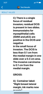 My pathology report looks good although the margins seem a little on the close side for my taste, “DCIS is less than 0.1cm from the medial margin” but I am not a doctor so what do I know? (Greg… I’m talking to you. Quit replicating in my damn tissue!) The pathology shows that this is still Invasive Ductal Carcinoma with a smattering of DCIS all over the place. DCIS is like pre-cancer, stage 0. The presence of DCIS seems to be an important factor in this diagnosis. I don’t know why, but it’s existence is thrown around a lot in general discussions about how to treat me.