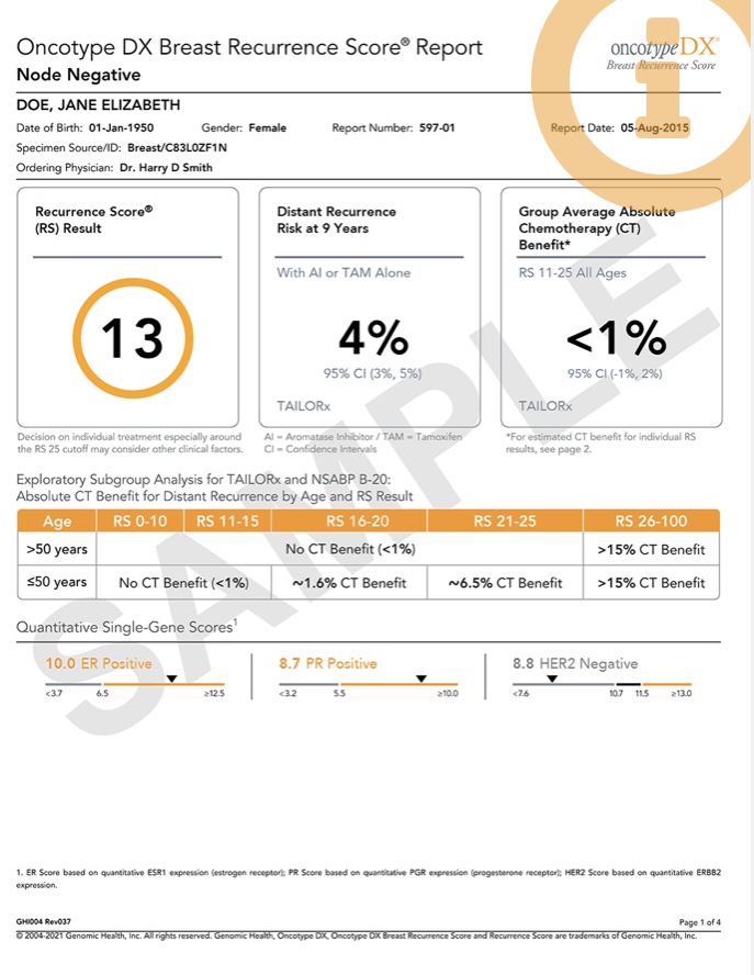 Some background. An oncotype is: “The Oncotype DX Breast Recurrence Score test provides a genomic-based, comprehensive, individualized risk assessment for early-stage invasive breast cancer in adjuvant and neoadjuvant settings. The test provides valuable information you can use to personalize a treatment plan specifically for each patient’s situation—including risk of distant recurrence, the benefit from chemotherapy and whether your patient can be treated effectively with hormonal therapy alone.“